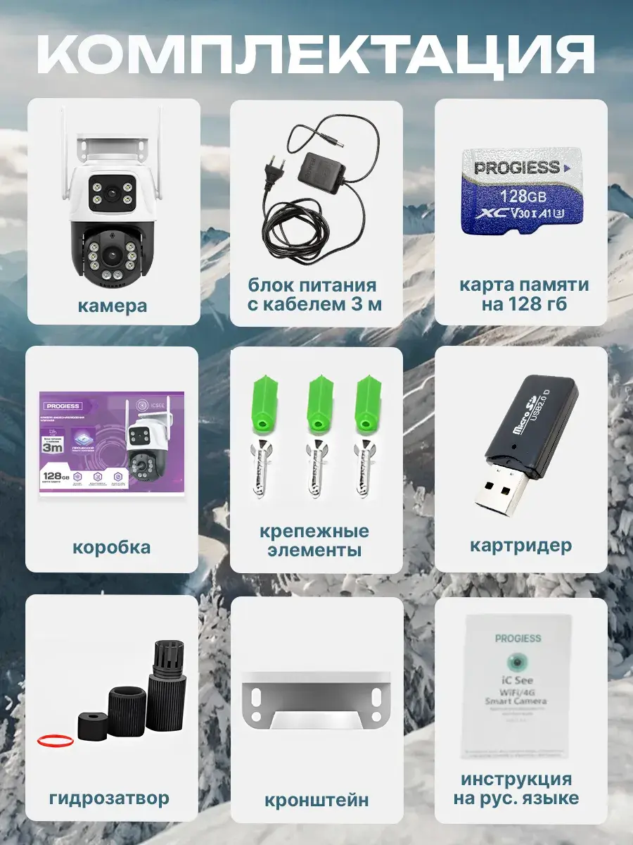 Руководство по эксплуатации - 1 шт., водонепроницаемый комплект - 1 шт., блок питания с кабелем 3м - 1 шт., камера видеонаблюдения уличная беспроводная - 1 шт., Карта памяти MicroSD 128 ГБ - 1 шт., USB картридер - 1 шт., крепежные элементы - 1 шт.