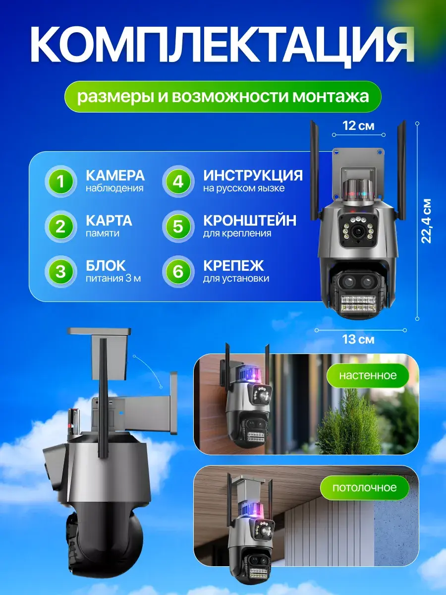 Карта памяти MicroSD 64 ГБ - 1 шт., Руководство по эксплуатации - 1 шт., водонепроницаемый комплект - 1 шт., блок питания с кабелем 3м - 1 шт., камера видеонаблюдения уличная беспроводная - 1 шт., крепежные элементы - 1 комплект